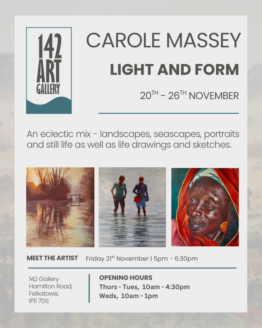 Carole has kindly invited me to exhibit some paintings at her exhibition at 142 Gallery in Felixstowe.